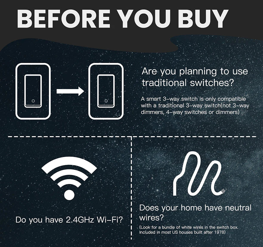 - 3 Way & Single Pole Switch: Uses 2.4 GHz Wi-Fi, eliminating the need for additional hubs or complicated setups. It has a maximum current rating of 10A and is compatible with non-dimmable bulbs.